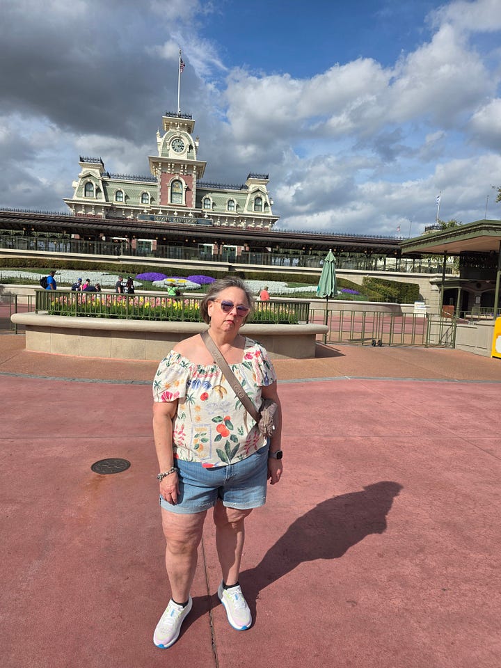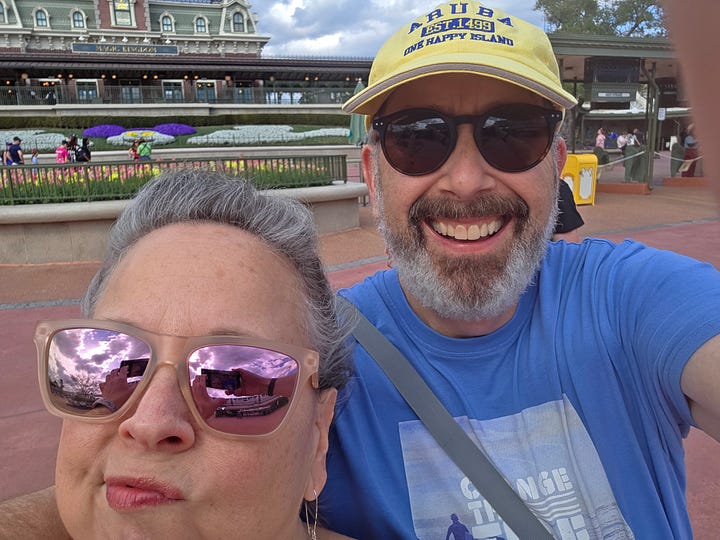 I am closing off this week’s email with four important photos from our vacation. We were in Florida, heading onto a cruise. We spent one day at DisneyWorld. Jeff is a Disneyphile; me, not at all. I agreed to a single park on a single day. Look how happy he is.
