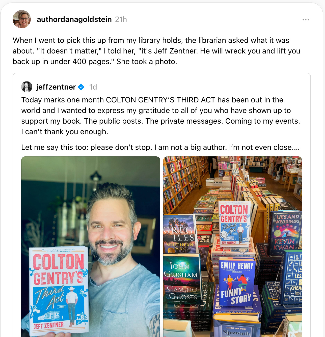 I’m about to dive into Jeff Zentner’s Colton Gentry’s Third Act. Most people have never heard of Jeff, but I found him thanks to a fellow writer. I had him on my podcast, What Were You Thinking, a couple of years ago. He is one of a handful of authors whose work I’ll read without hesitation. From the first few pages, I already know this book will not disappoint.