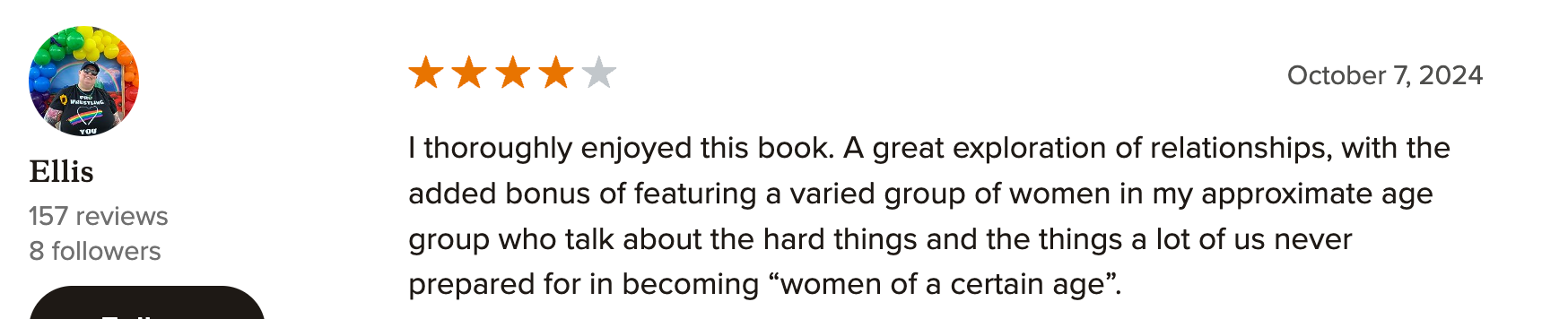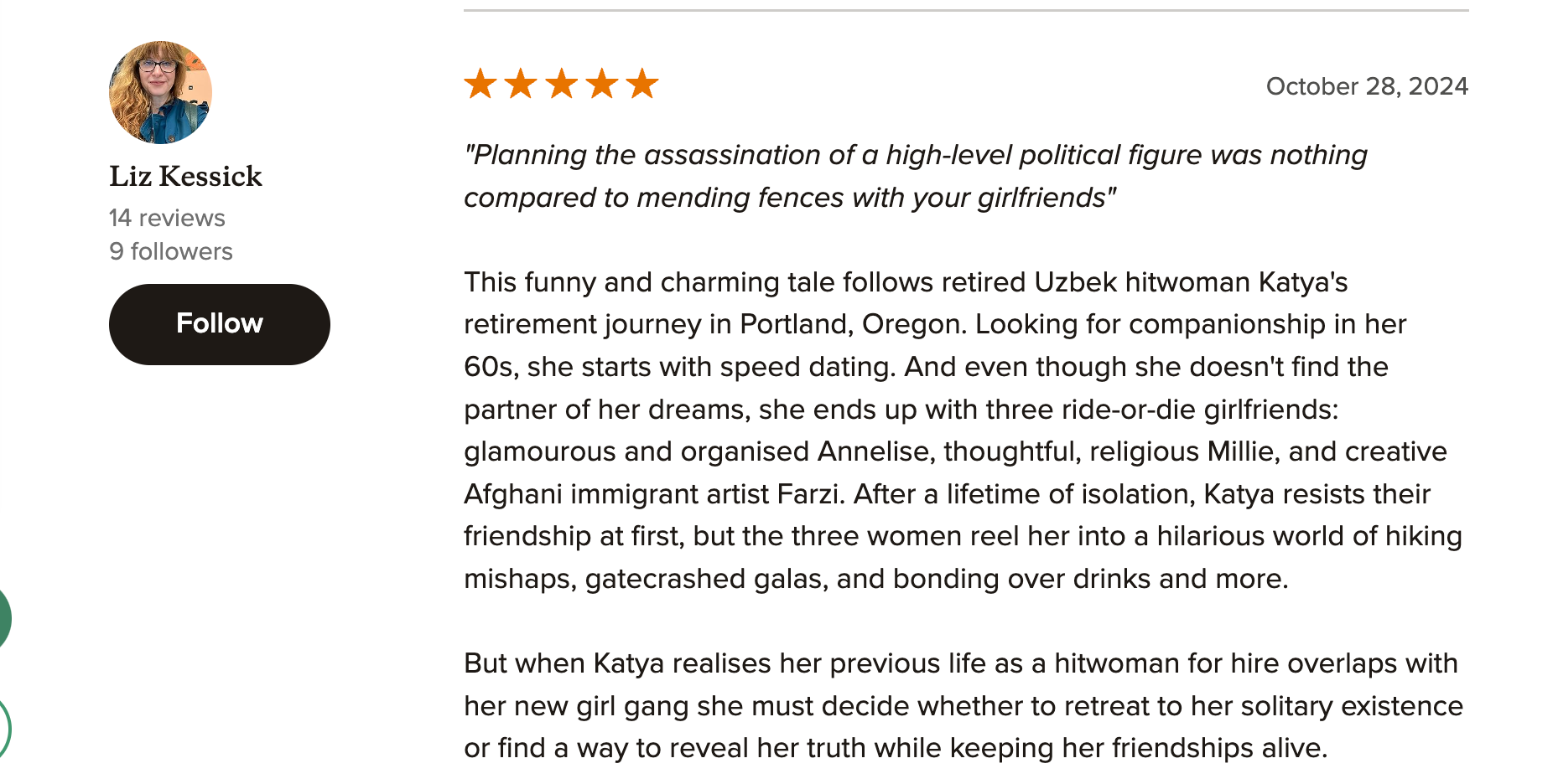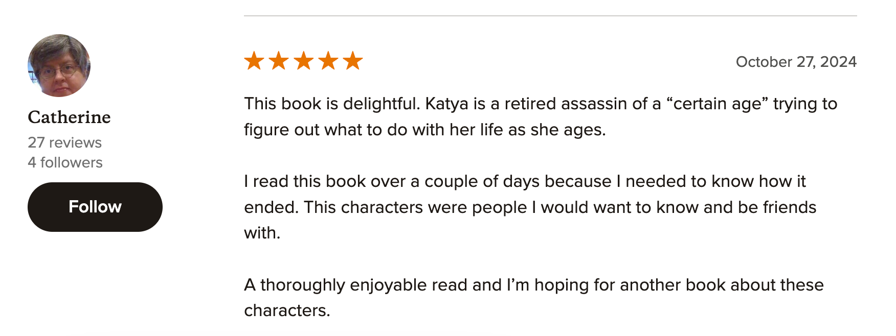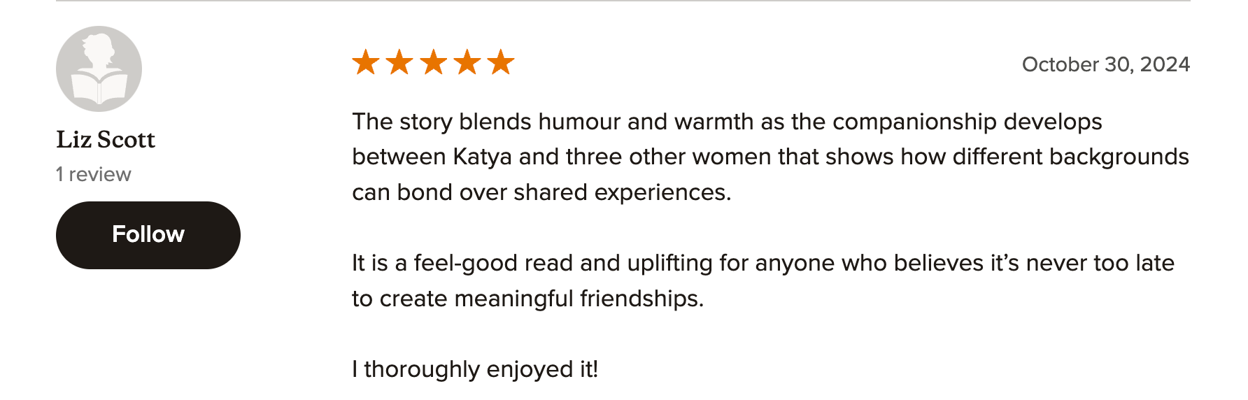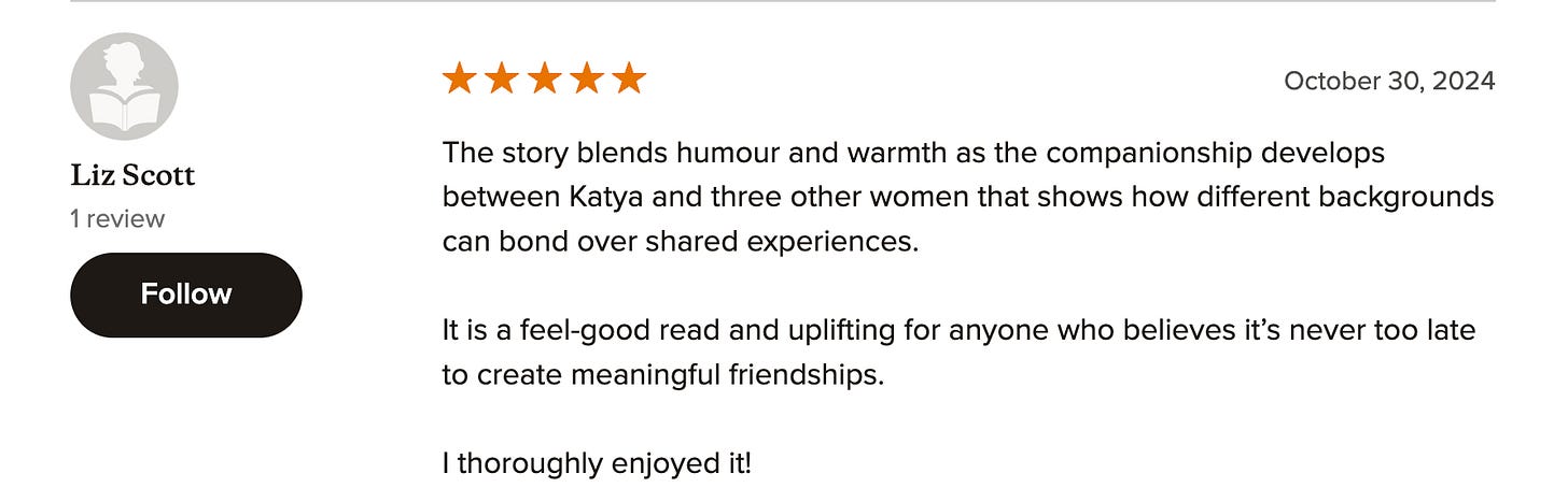 I intended the novel to be a cozy, feel-good story about sisterhood, and judging by the early reviews from the ARC readers, Katya is hitting the mark.