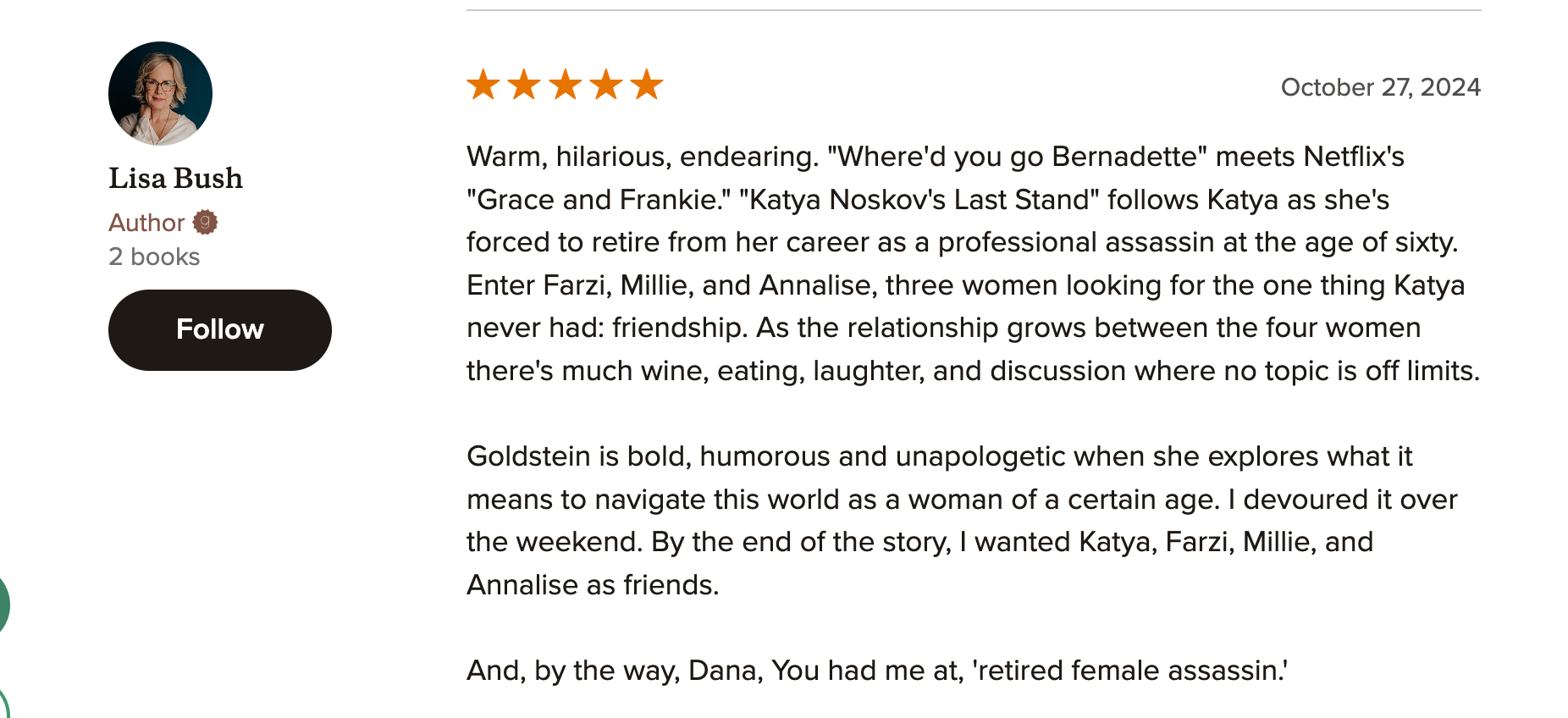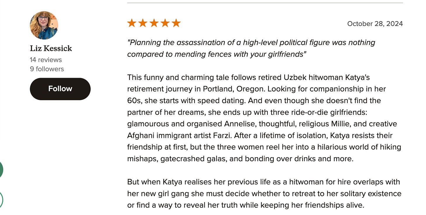 Katya Noskov’s Last Shot is feeling very different. I am so excited about my debut upmarket fiction for so many reasons. It features women over the age of 50, a demographic that is not sexy in the eyes of traditional publishers. These women are strong, with varied backgrounds and histories. They come together in pursuit of friendship, and we know how hard it is to make friends when you are an adult. Which is why I decided to make one of them, Katya, a retired assassin. I mean, if it’s hard for me to find good friends, imagine what it must be like if you never developed the skill set for that in the first place.