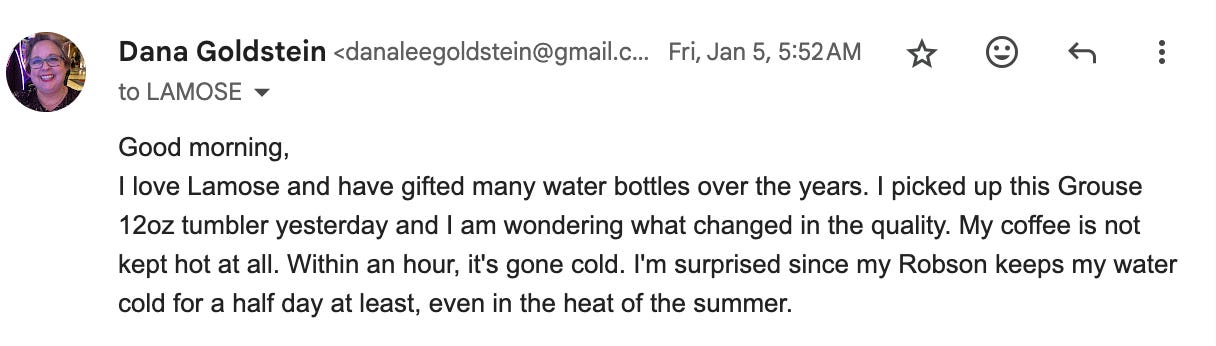 In 2020, I bought my kids 28oz bottles (this will be important in a moment). In 2021, I bought my husband a bottle. My next order wasn’t until January this year, when I ordered myself a coffee tumbler, the first time I ordered hot beverage drinkware from Lamose.